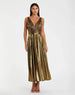 Crafted from shimmering metallic jersey fabric, this dress boasts a plunging neckline and ruched bodice. Perfect for any special occasion, this dress will leave you feeling glamorous and confident.